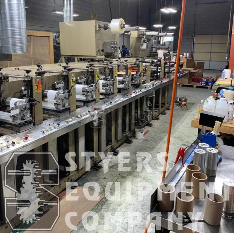 2 DIE STATIONS, SHEETING STATION, 2 PRODUCT REWINDS, 2 WASTE REWINDS, LAMINATING, TURNBAR, ROLL LIFT, CONVEYOR, CORONA TREATER, HOT AIR AND IR DRYING WITH 3 AAA UV DRYERS, SCORE SLITTING, 2 WEB GUIDES, DELAM/RELAM, INCLUDES TRANSFORMER, DOCTOR BLADES, 8 CERAMIC ANILOX, 50 PRINT CYLINDERS. M-10, E-10, C-7