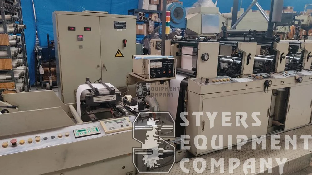 1/8 PITCH, 3 DIE STATIONS, SHEETING STATION, 2 PRODUCT REWINDS, 1 WASTE REWIND, LAMINATING, CONVEYOR, TURN BAR, ROLL LIFT, HOT AIR AND ONE UV DRYING, SHEAR SLITTING, DELAM/RELAM, WEB GUIDE, VIDEO WEB INSPECTION, 11 CERAMIC ANILOX, 215 PRINT CYLINDERS M-10, E-10. C-10