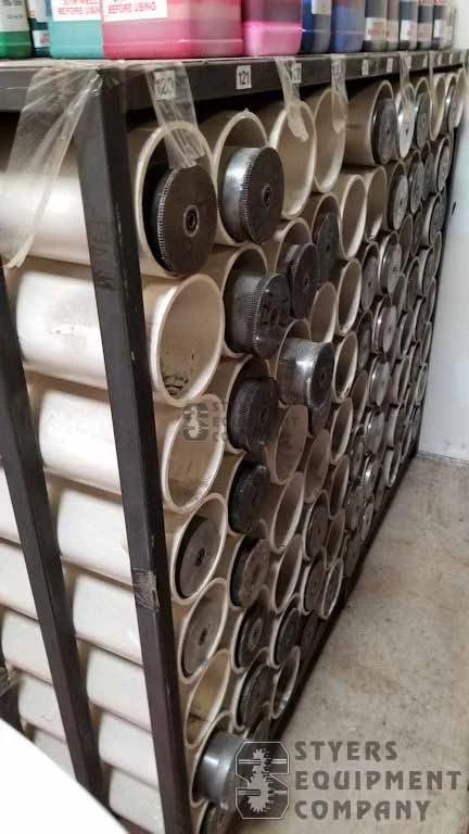 APPROXIMATELY 587 PRINT CYLINDERS WITH SPUR GEARS FOR A MARK ANDY 2200, 1/8P PRESS AND 3 SQUARE STEEL TUBE RACKS