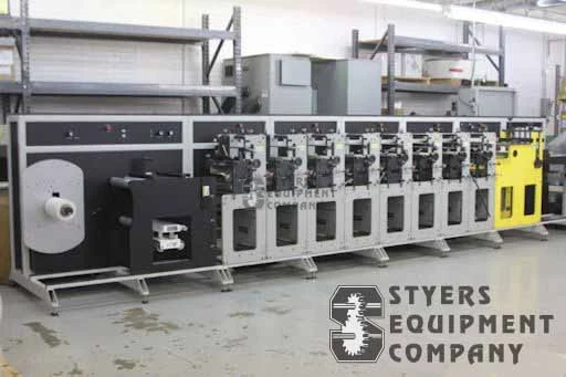 CLOSED LOOP INFEED TENSION, 9 CERAMIC ANILOX ROLLERS, DOCTOR BLADES, 360 DEG REGISTER, OVERHEAD RAIL SYSTEM, 15 HP MOTOR.