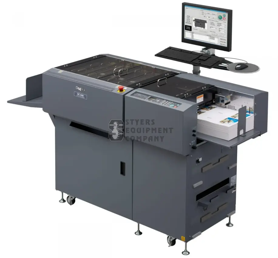 The DUPLO DC-646 Slitter/Cutter/Creaser. New condition, offering precision and versatility for your print finishing needs. Optimize workflow with seamless slitting, cutting, and creasing. Ideal for professional-grade results.