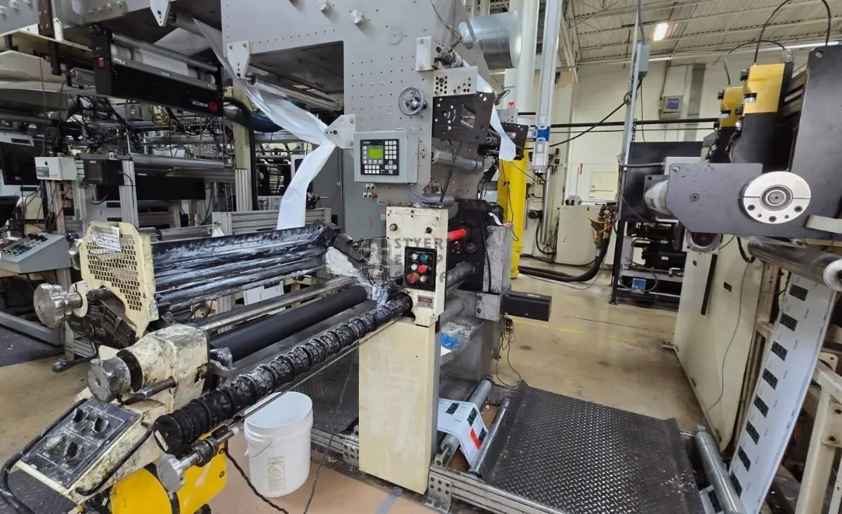 9 Chill Rolls, Automatic Throws / Constant Turn Anilox Rolls, 10 Quick Change Anilox Assemblies, (9) 360 degree Register Units, 9 Motorized Registration Units, 1 Video Web Inspection System, Anilox Rolls, Plate Cylinders, ncludes (9) raised chill drums w/chiller, Flexair Compressed Air Drying system with Compressor and overhead extended lamination dryer, servo-driven lam nip with chill-drum/chiller & heated drum w/oil heater, Martin MBSF 40" OD unwind butt splicer, Martin LRD 24" OD rewind turret, Softal 3DT single side corona treater prior to printing, KTI 90 degree lamination unwind butt splicer & Softal corona treater, BST Eltromat Tubescan 100% defect detection & film trim removal. All intake exhaust ducting included.